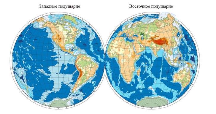 Физическая карта полушарий на ней   ; изображены две половинки земного шара : Западное и Восточное полушария.
